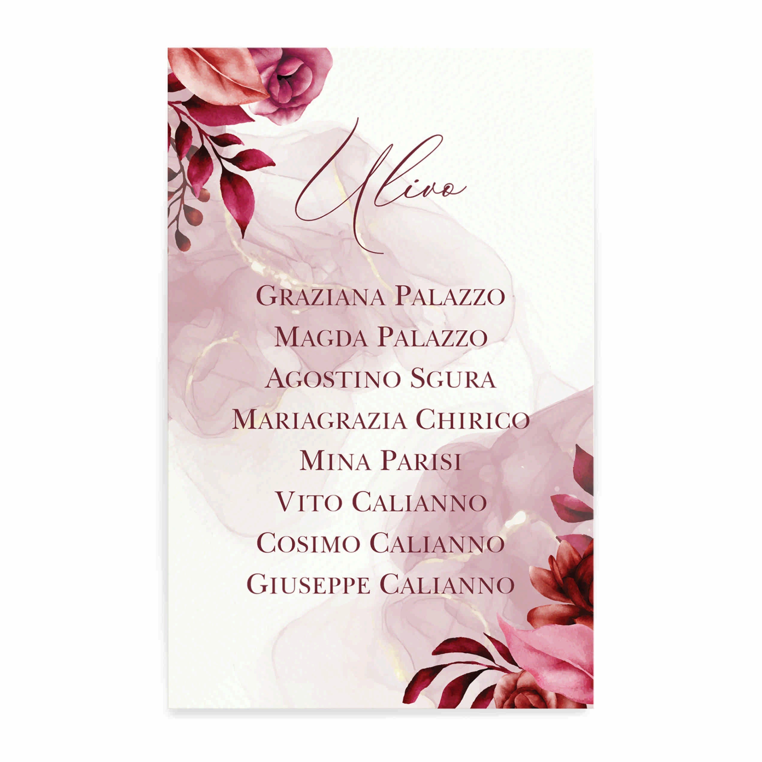 Cartoncino per tableau matrimonio con nome del tavolo e nome invitati, font e colore personalizzabile. Carta e grafica abbinata al modello di partecipazione F1744 Tema grafico decori floreali sui colori del rosso e del bordeaux.