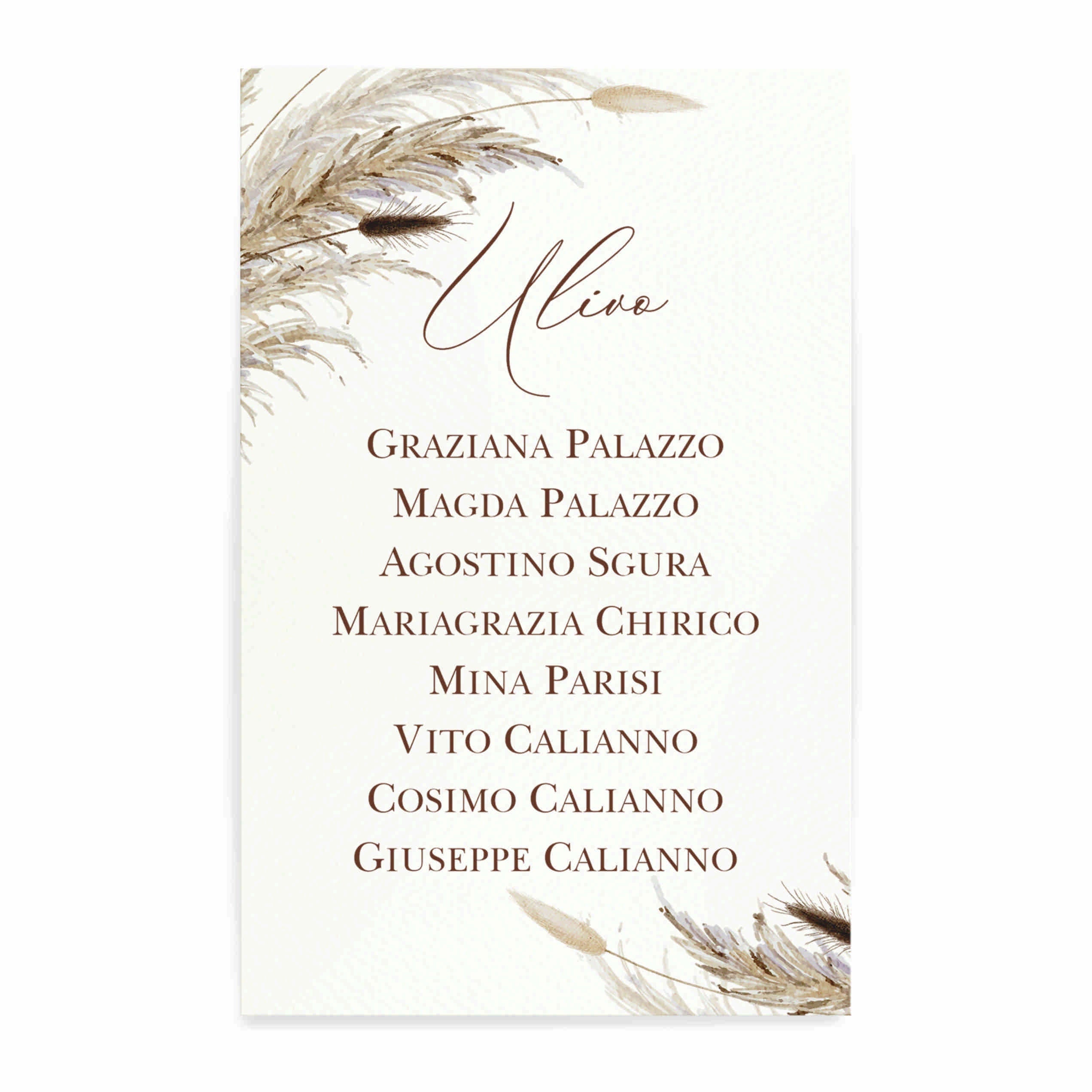 Cartoncino per tableau matrimonio con nome del tavolo e nome invitati, font e colore personalizzabile. Carta e grafica abbinata al modello di partecipazione F1746 stile shabby chic tema grafico pampas.