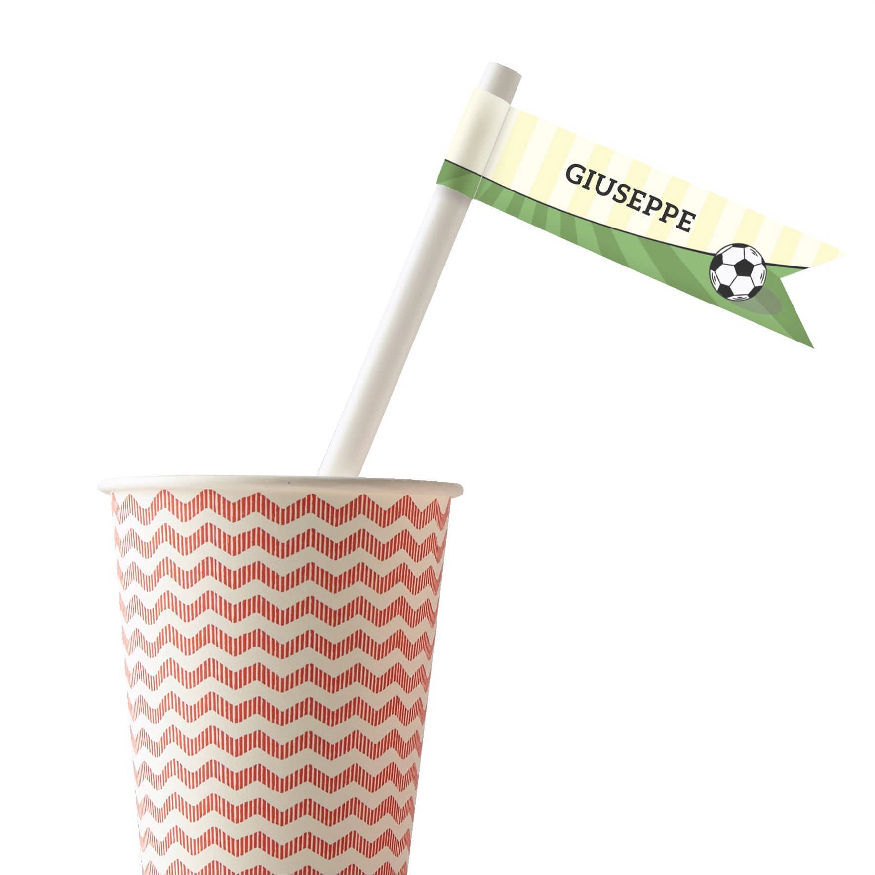 Bandierina per cannuccia tema calcio personalizzata con nome , in cartoncino stampato a colori. Si arrotola attorno alla cannuccia aderendo perfettamente grazie all’utilizzo di un biadesivo fornito. Materiale: cartoncino bianco spesso, Formato: 87x15 mm