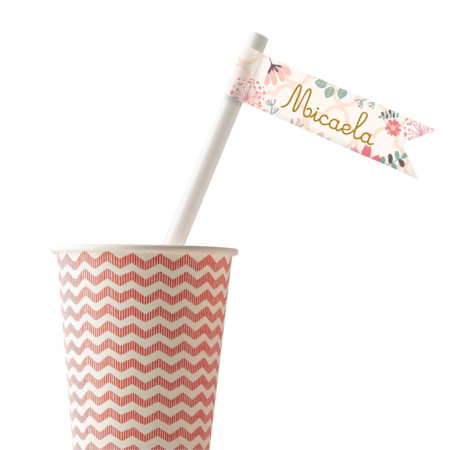 Bandierina per cannuccia tema principessa personalizzata con nome , in cartoncino stampato a colori. Si arrotola attorno alla cannuccia aderendo perfettamente grazie all’utilizzo di un biadesivo fornito. Materiale: cartoncino bianco spesso, Formato: 87x15 mm
