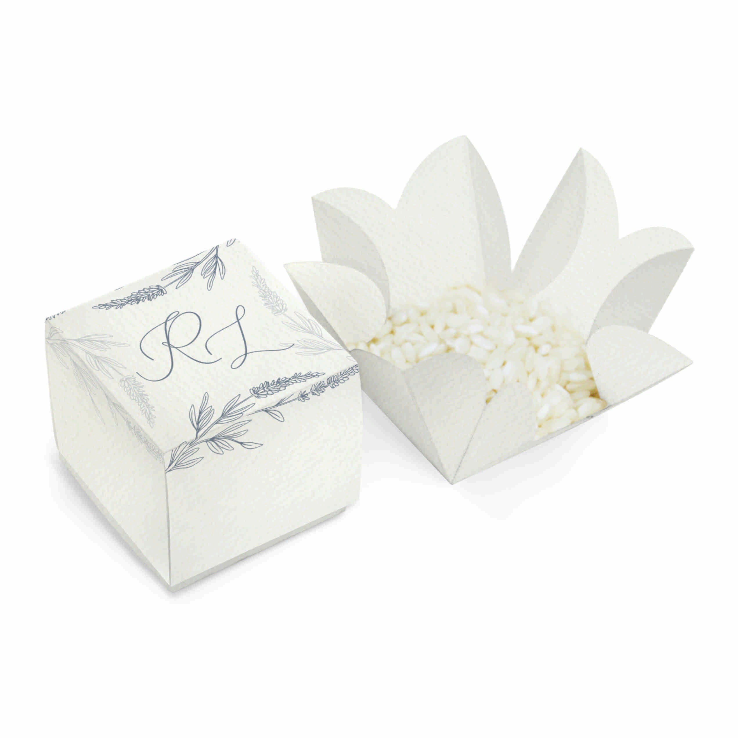 Scatolina per matrimonio portariso o confetti, di forma quadrata 4x4 cm, personalizzata con iniziali sposi, in coordinato con il modello di partecipazione F1759 All'interno è possibile inserire una bustina porta riso (non compresa) tema grafico lavanda