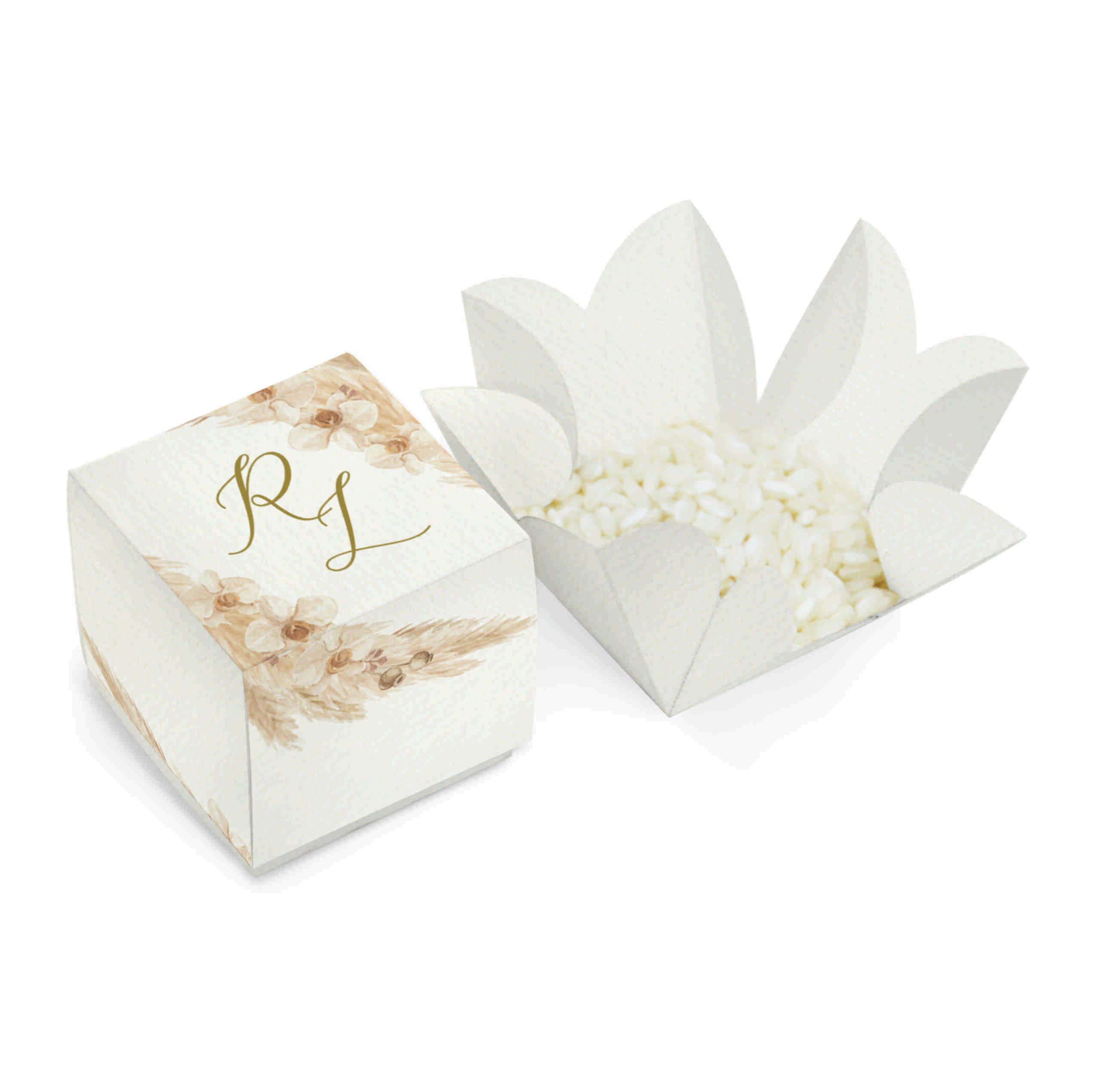 Scatolina per matrimonio portariso o confetti, di forma quadrata 4x4 cm, personalizzata con iniziali sposi, in coordinato con il modello di partecipazione F1763 All'interno è possibile inserire una bustina porta riso (non compresa) tema grafico decoro pampas