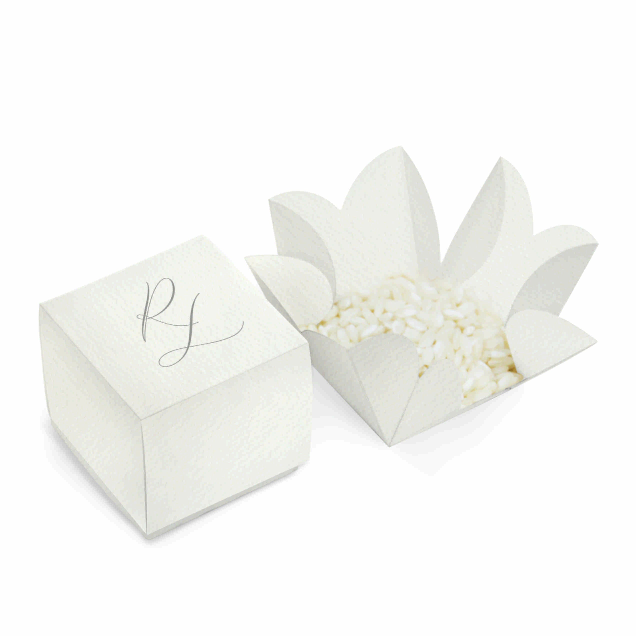 Scatolina per matrimonio portariso o confetti, di forma quadrata 4x4 cm, personalizzata con iniziali sposi, in coordinato con il modello di partecipazione F1766 All'interno è possibile inserire una bustina porta riso (non compresa) tema grafico Lavanda
