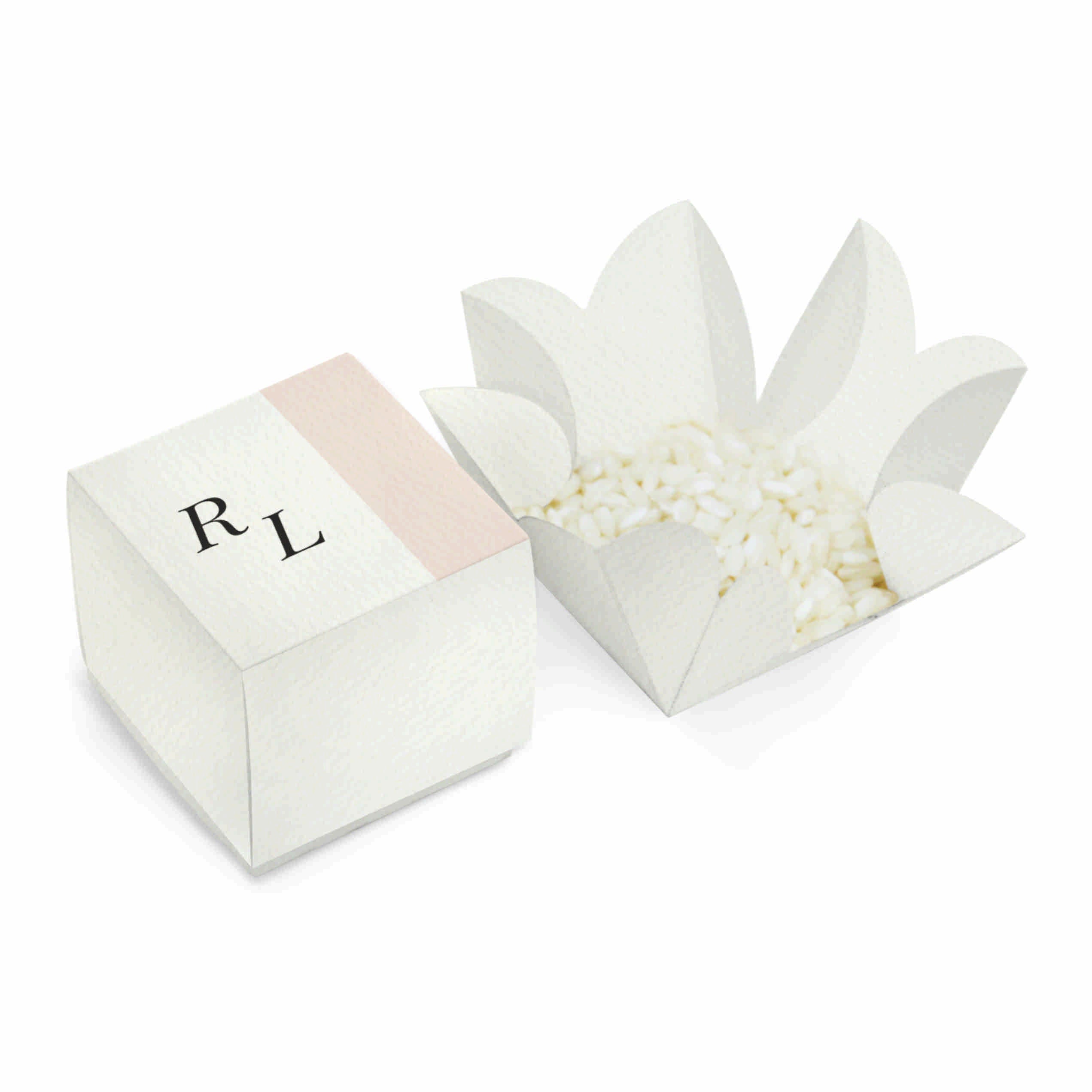 Scatolina per matrimonio portariso o confetti, di forma quadrata 4x4 cm, personalizzata con iniziali sposi, in coordinato con il modello di partecipazione F1770 All'interno è possibile inserire una bustina porta riso (non compresa) tema grafico elegante e romantico
