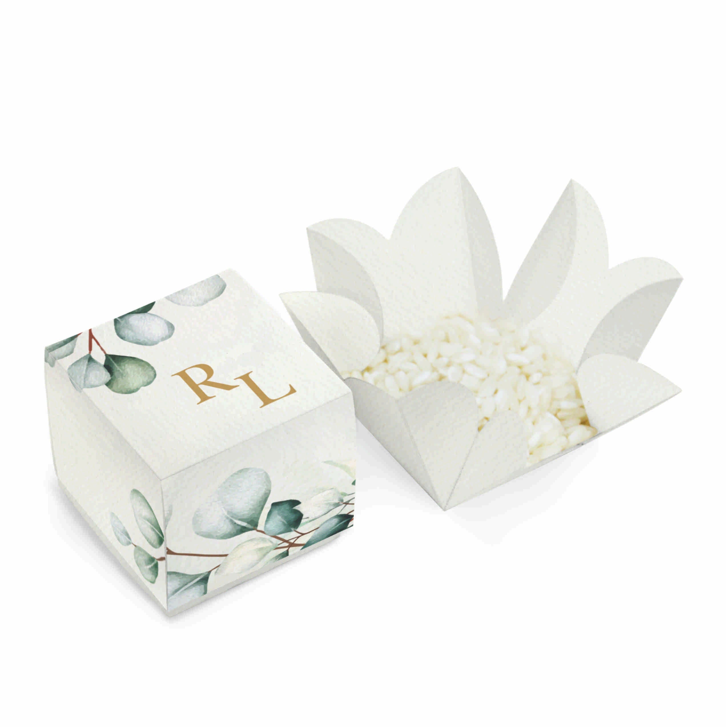 Scatolina per matrimonio portariso o confetti, di forma quadrata 4x4 cm, personalizzata con iniziali sposi, in coordinato con il modello di partecipazione F1773 All'interno è possibile inserire una bustina porta riso (non compresa) tema grafico decori floreali Verde