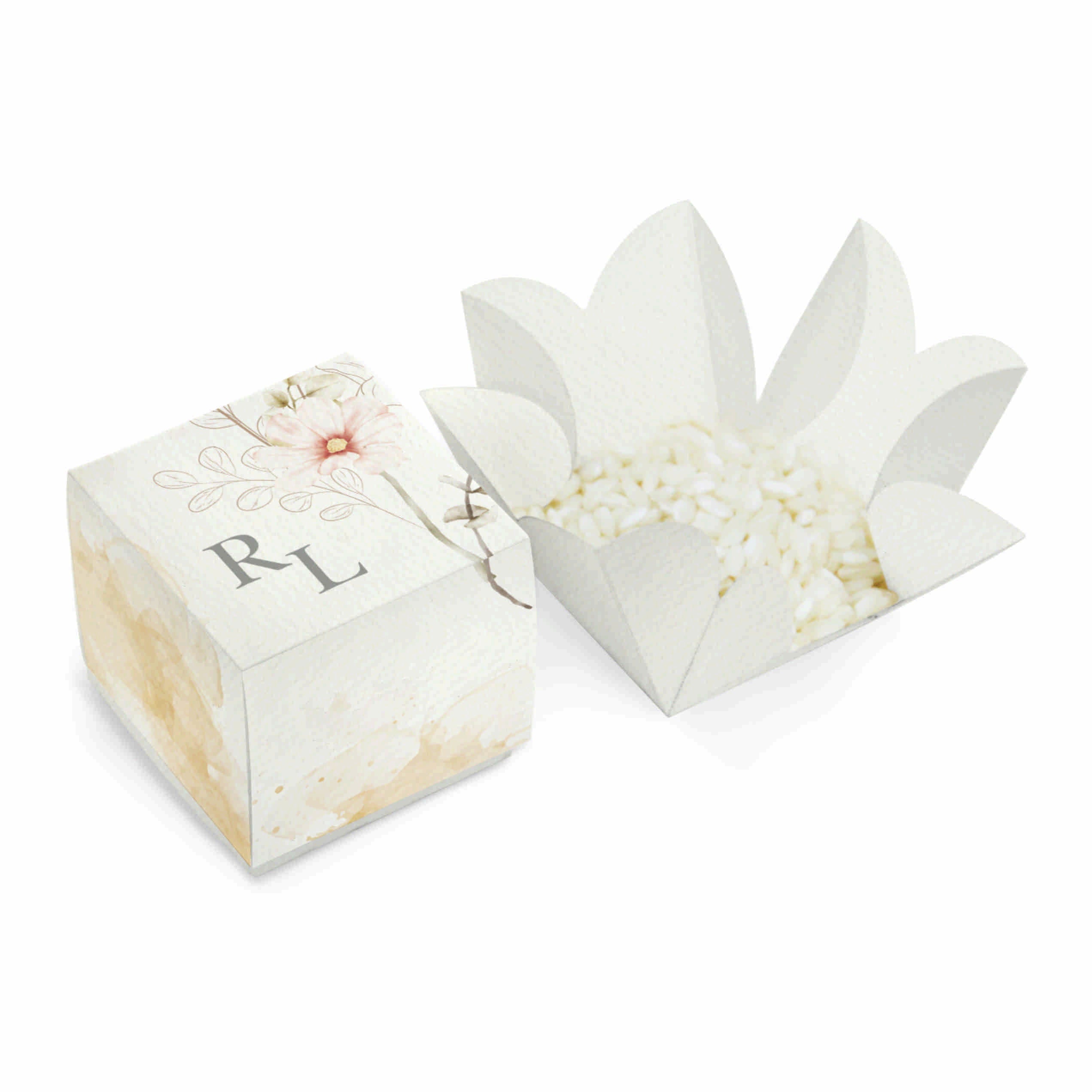 Scatolina per matrimonio portariso o confetti, di forma quadrata 4x4 cm, personalizzata con iniziali sposi, in coordinato con il modello di partecipazione F1774 All'interno è possibile inserire una bustina porta riso (non compresa) tema grafico shabby chic, con sfumature e decori floreali sui colori dell'avorio e del rosa.