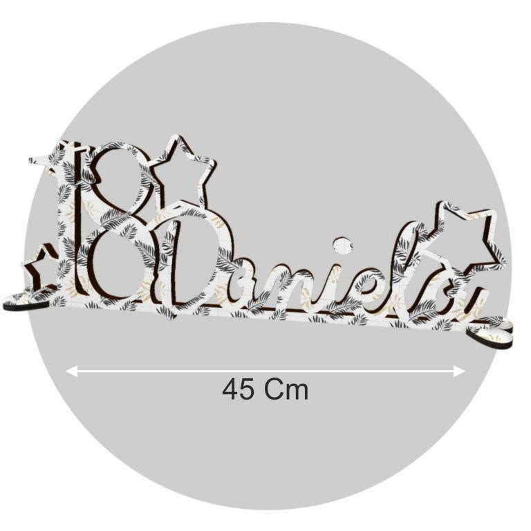 Scritta in legno colorata con stelle, personalizzata ed autoportante, carta adesiva stampata ed accoppiata al legno, spessore 6 mm, con base cm 45 cod. FWP-M 07; ideale per 18 anni.