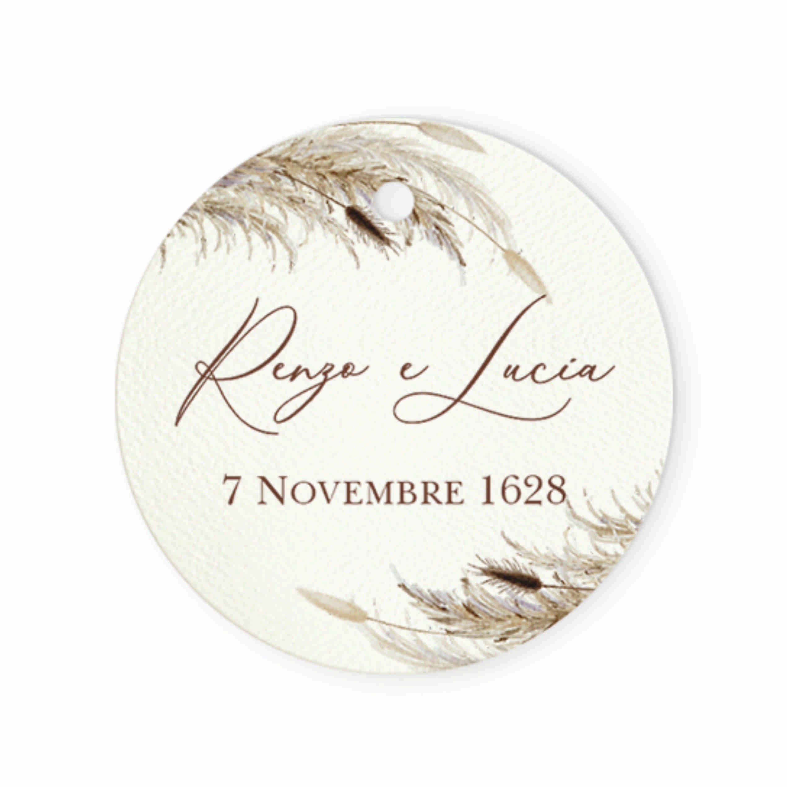 Tag bomboniere segnaposto personalizzato con nomi sposi e data del matrimonio, abbinato al modello partecipazione di nozze F1746 stile shabby chic tema grafico pampas.