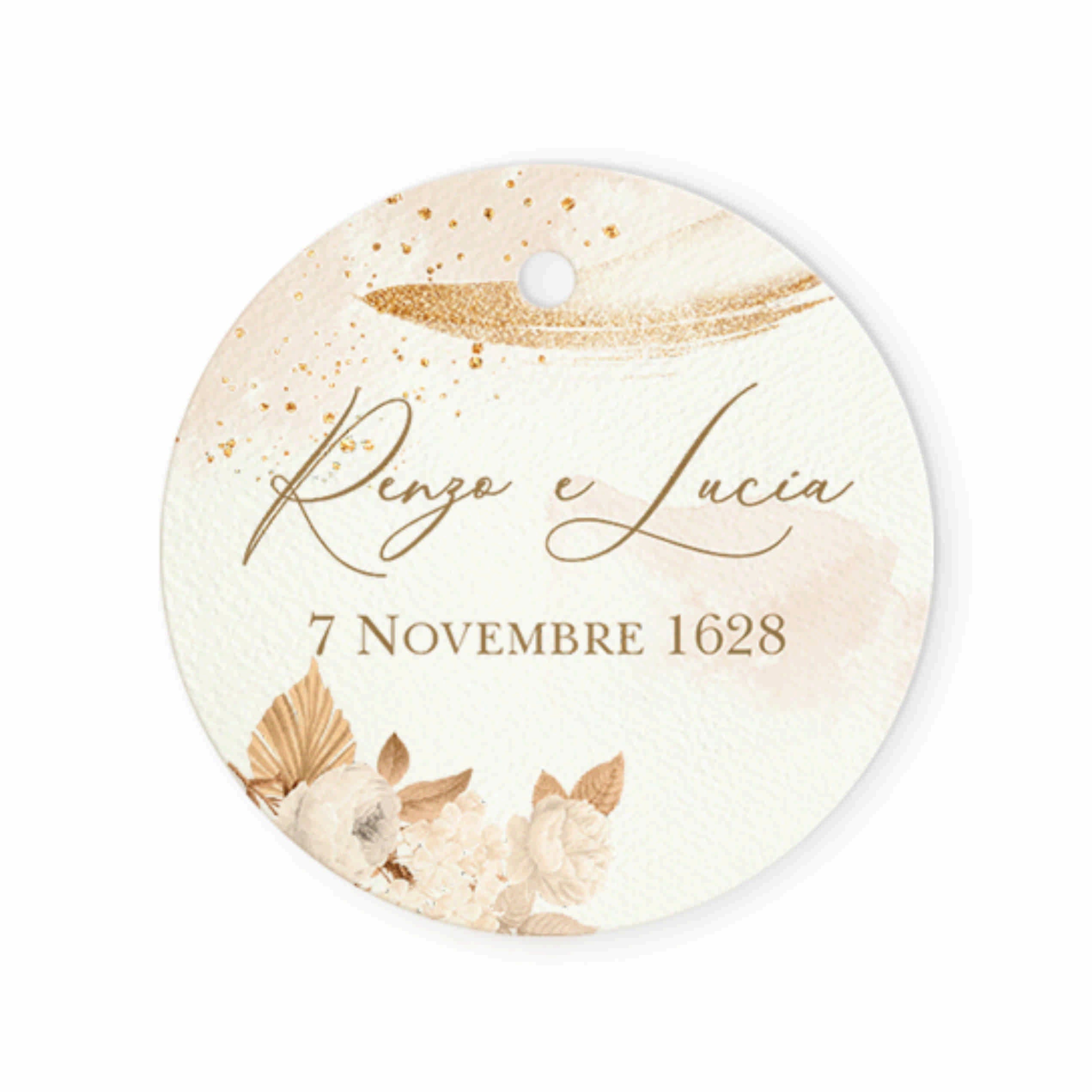 Tag bomboniere segnaposto personalizzato con nomi sposi e data del matrimonio, abbinato al modello partecipazione di nozze F1747 in stile shabby chic Tema grafico rose e fiorellini bianchi e foglie sui toni del bronzo