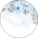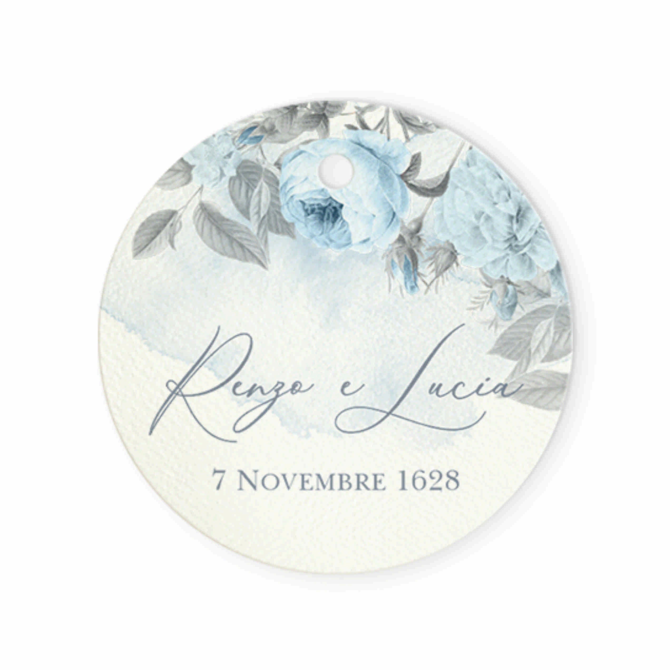 Tag bomboniere segnaposto personalizzato con nomi sposi e data del matrimonio, abbinato al modello partecipazione di nozze F1748 Tema grafico Rose sui toni del celeste Polvere