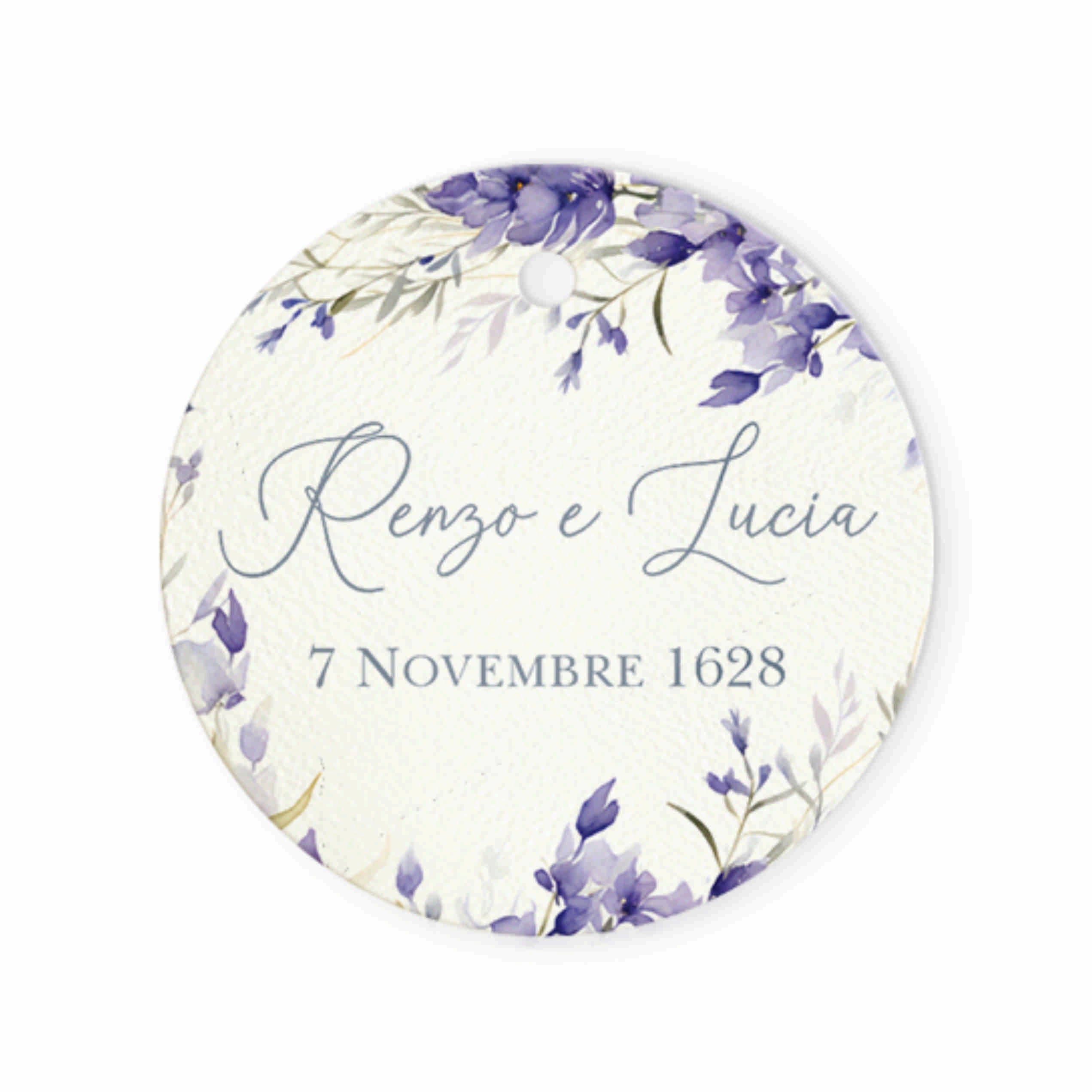 Tag bomboniere segnaposto personalizzato con nomi sposi e data del matrimonio, abbinato al modello partecipazione di nozze F1750 stile provenzale, Tema grafico decoro floreale Lavanda