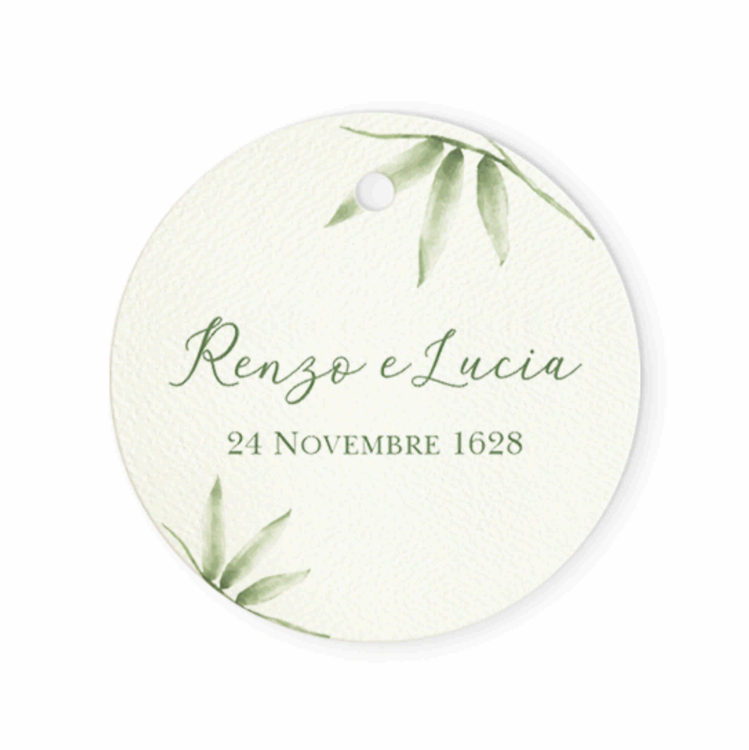 Tag bomboniere segnaposto personalizzato con nomi sposi e data del matrimonio, abbinato al modello partecipazione di nozze F1760 tema grafico decoro bambù