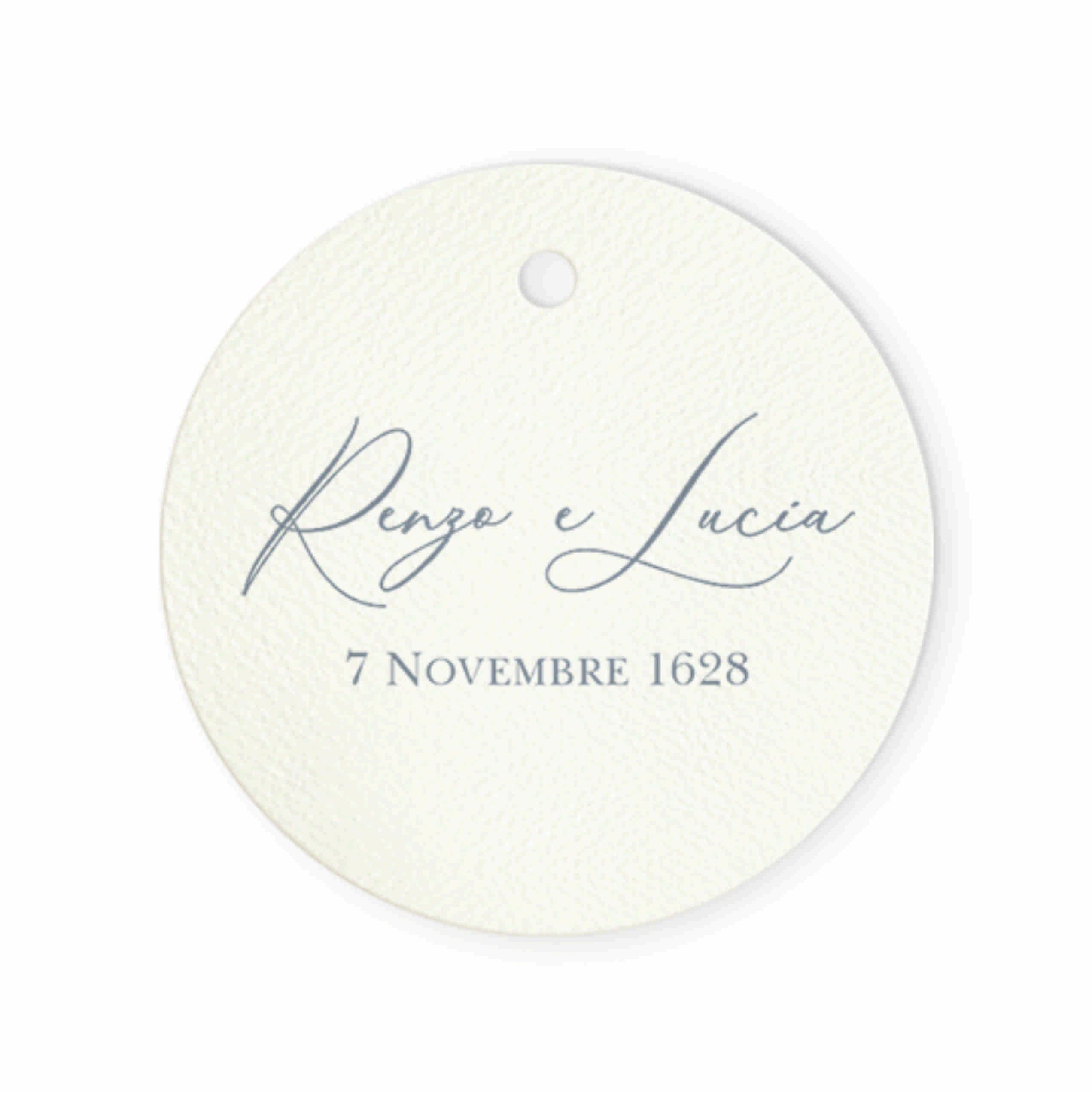 Tag bomboniere segnaposto personalizzato con nomi sposi e data del matrimonio, abbinato al modello partecipazione di nozze F1764 Tema grafico celeste polvere