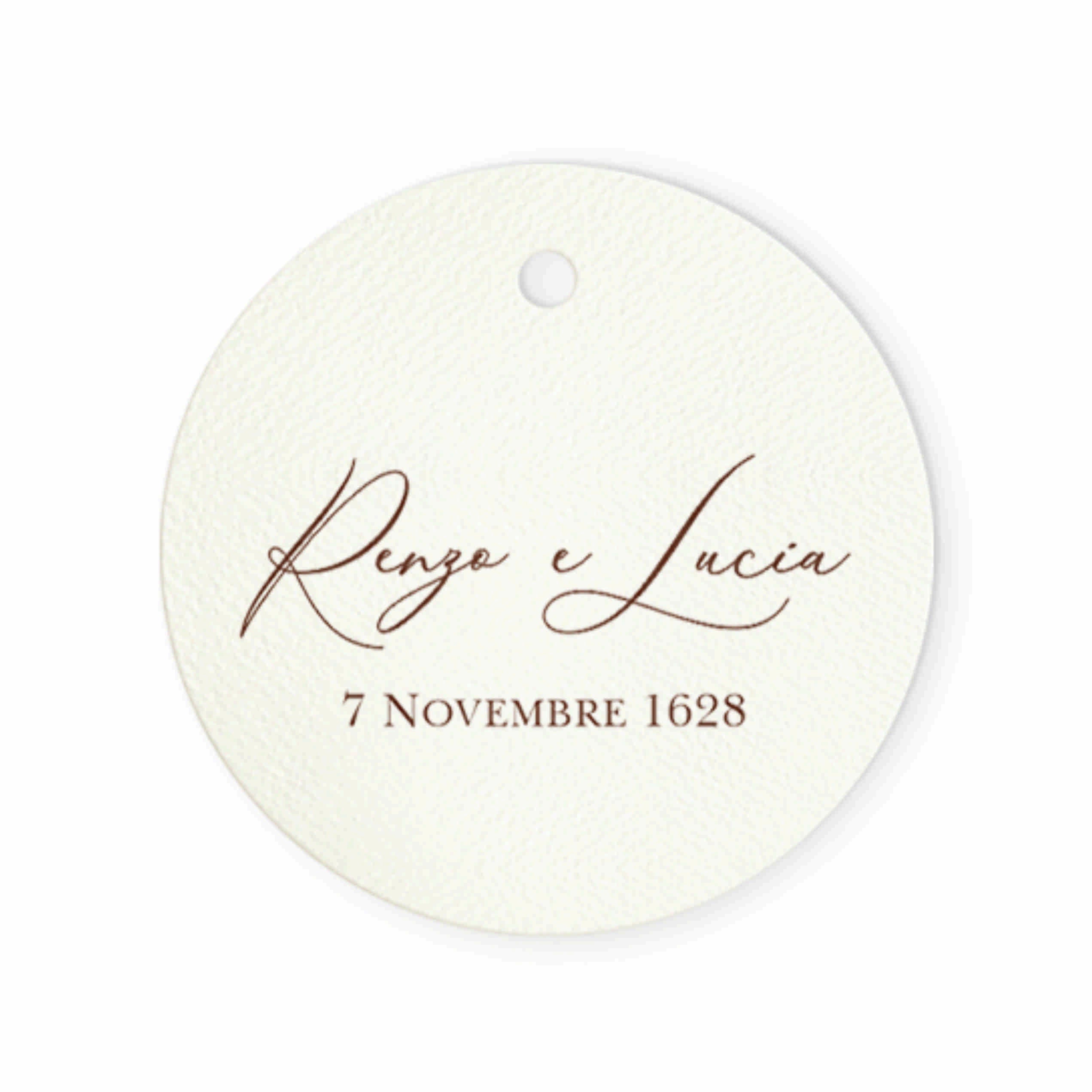 Tag bomboniere segnaposto personalizzato con nomi sposi e data del matrimonio, abbinato al modello partecipazione di nozze F1765 tema grafico raffinato ed elegante