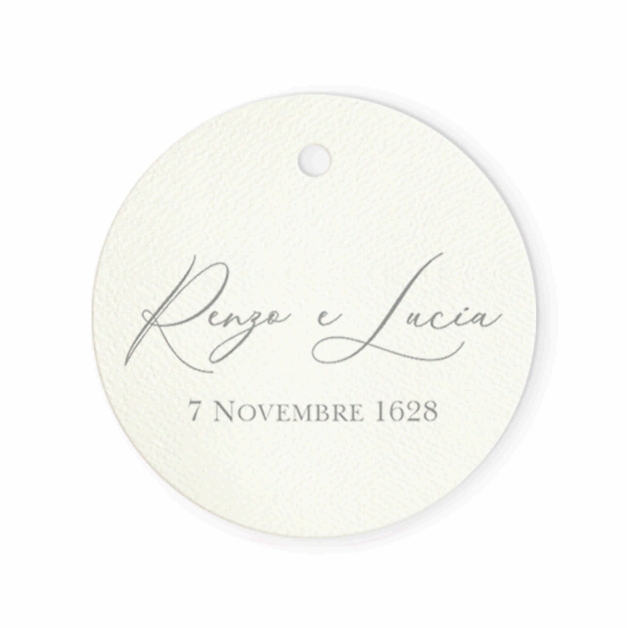 Tag bomboniere segnaposto personalizzato con nomi sposi e data del matrimonio, abbinato al modello partecipazione di nozze F1766 tema grafico Lavanda