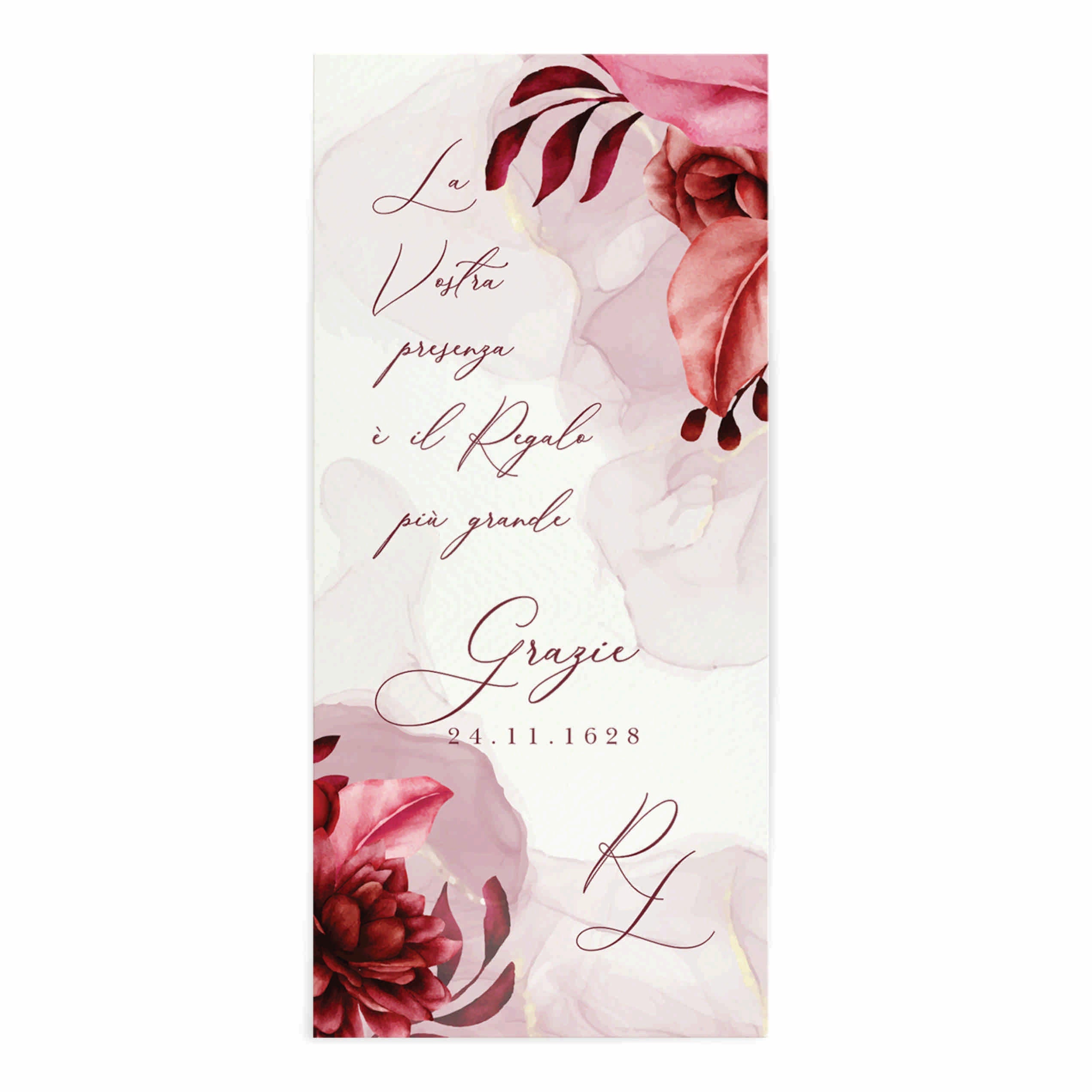 Segnaposto matrimonio ringraziamento cartoncino personalizzato con frase di ringraziamento per invitati personalizzabile, nomi sposi e data del matrimonio. Per dire Grazie con eleganza e classe ai tuoi invitati. In coordinato con il modello partecipazione di nozze F1744 Tema grafico decori floreali sui colori del rosso e del bordeaux.
